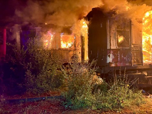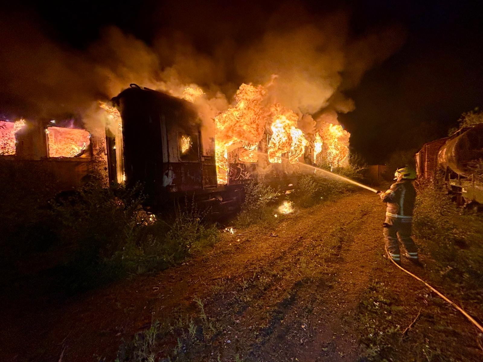 Firefighters extinguish blaze inside derelict railway carriages