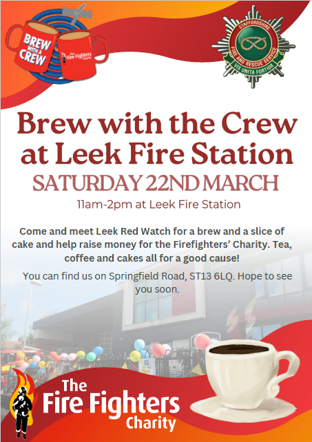 On Saturday 22 March, we are opening our doors at Leek Fire Station between 11am and 2pm to welcome members of the community for a cup of tea in aid of The Fire Fighters Charity.